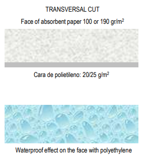 Absorption and protection thanks to its double layer: one made of absorbent paper and other made of waterproof polyethylene