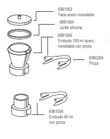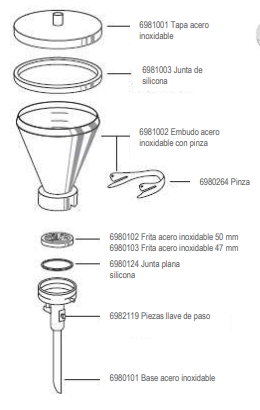 Partes y materiales: Tapa, embudo, base, soporte, abrazadera y llave de paso de acero inoxidable. Junta plana y junta de la tapa de silicona.