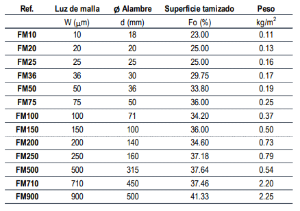 - Peso: (G): Para tejidos metálicos de acero inoxidable es G=12,61 x (d2/p), expresado en kg/m2. En cuanto a la calidad del material, se trata siempre de acero inoxidable calidad AISI 304 ó 316. La gama está formada por filtros con luz de malla desde 10 hasta 900 μm.