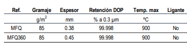 Filtros fabricados exclusivamente con microfibra de cuarzo puro al 100% (Si O2), exentos de cualquier tipo de ligante o de otras sustancias. Especialmente recomendados en controles de emisión en chimeneas industriales, sobretodo cuando se requiere un filtro de elevada pureza o cuando las condiciones físicas o químicas sean extremas: temperatura superior a 500oC o fuerte concentración de gases ácidos (excepto HF). Se fabrican 2 calidades, una standard y otra mas pura, tratada térmicamente para conseguir el mínimo contenido en metales.