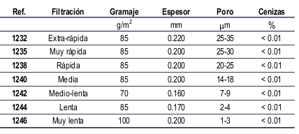 Los papeles filtro para análisis cuantitativo FILTER-LAB® están fabricados bajo las más estrictas exigencias de calidad, no solo de las materias primas utilizadas, sino también de las condiciones en que se realizan los procesos de elaboración. Para su fabricación se utilizan fibras de celulosa y linters de algodón de elevada pureza, cuyo contenido en alfa-celulosa es de practicamente el 100%. En cualquier caso, las fibras de celulosa en su estado natural contienen pequeñas cantidades de impurezas orgánicas e inorgánicas. Es por ello que estos papeles filtro requieren un proceso de elaboración especial. Una vez fabricado el papel filtro en la condiciones físicas deseadas (gramaje, espesor, velocidad de filtración, etc.) se inicia un proceso de lavado con ácidos (generalmente HF y HCl) que concluye con una limpieza final con agua desmineralizada. Con ello se consiguen dos características importantes: elevada resistencia al estado húmedo y contenido en cenizasinferioral 0.01%. Por todo ello estos filtros son especialmente adecuados en la filtración con embudos Büchner en análisis cuantitativos y gravimetrías, ya que cumplen con las normas internacionales sobre contenido en cenizas. Esta gama está formada por 7 calidades con diferentes retenciones de partículas y velocidades de filtración: